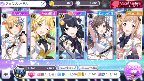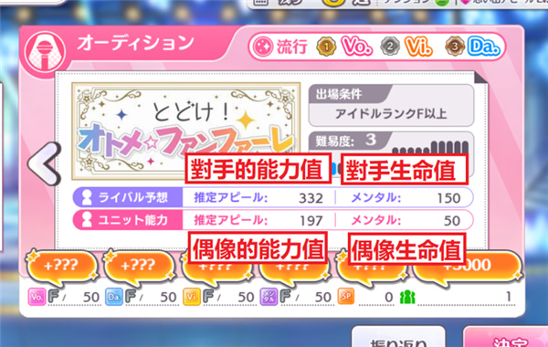 开始育成前,需选择一位育成偶像与五位辅助偶像组成队伍;最右侧的辅助偶像为宾客,无法参与现场演出。队伍搭配对育成结果影响显著。