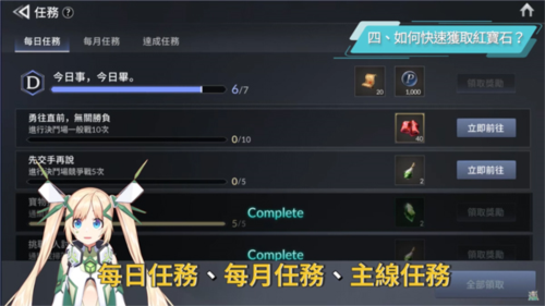 红宝石是游戏中重要的流通资源,可用于抽取角色、装备与宠物,也能用于解锁精通或购买各类道具。获取途径包括每日签到、每日与每月任务、主线推进、竞技场对战、无限之塔挑战等;完成特定难度下英雄无阵亡的主线任务也能获得奖励。过程中还会经常获得角色与宠物召唤券,因此建议尽可能完成各类任务,以加速资源积累。