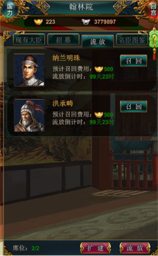 每位大臣的属性侧重不同,有的擅长商业,有的侧重军事,玩家可根据自身发展策略选择优先培养对象。若对某位大臣不满意,可选择流放;但在流放期间召回需根据剩余时间消耗一定元宝。