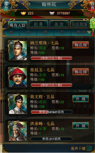 大臣培养主要在翰林院进行。游戏初期会拥有四位初始大臣,等级均从一级开始提升。
