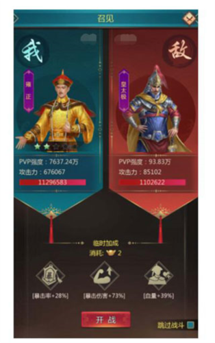 (1)大臣战斗能力取决于其攻击力与血量,即PVP强度;大臣的天赋效果在战斗中也会生效。