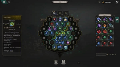 技能符文为六边形物品,带六个随机颜色槽位,连接符文需颜色匹配方可生效;连接符文能增强主动技能效果,例如提升伤害、扩大范围或增加投射数量。