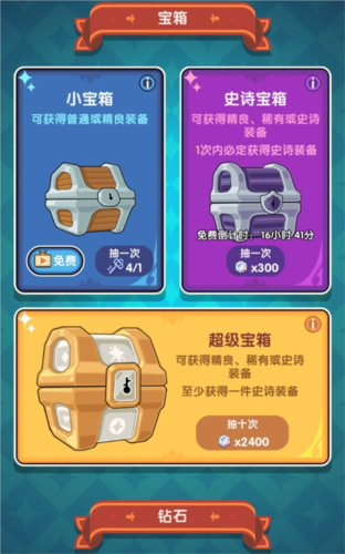 小宝箱每日可免费领取一次,也可用钥匙兑换或钻石购买;能产出白色与绿色品质装备。