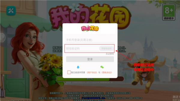 1、启动我的花园游戏后,在指定位置填写您的手机号码。