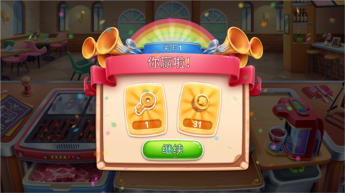 游戏中通关条件分为三种类型:1、营业赚取指定金额金币;2、获得一定数量顾客好评;3、上够指定数量菜品。