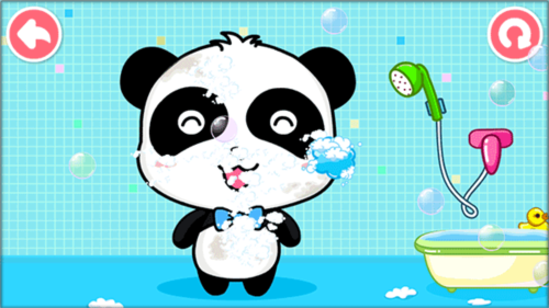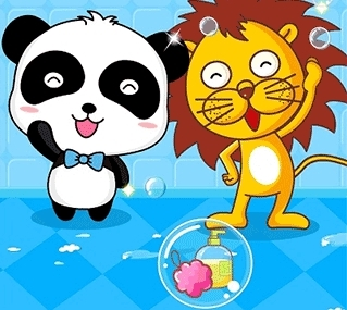 洗澡:动物朋友来洗澡啦,全身满是肥皂泡泡,左搓搓右揉揉,泡泡冲干净后,还会发现亮闪闪的小星星呢。