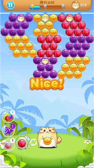 帮助开心的小猫发射不同颜色的泡泡,选择合适角度进行射击;