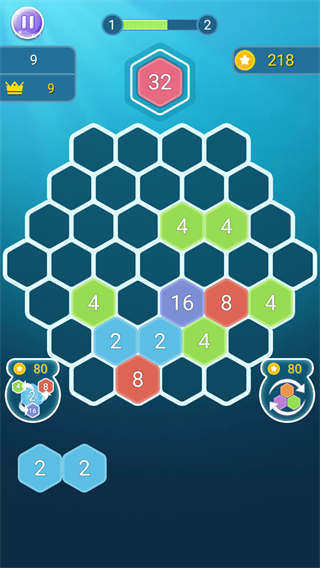 2、六边形消除:玩法比经典数独更自由,支持横向、左斜向、右斜向的连线消除;当备选方块无法放入棋盘时游戏结束。