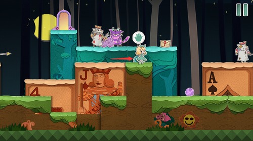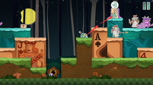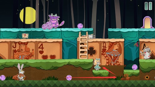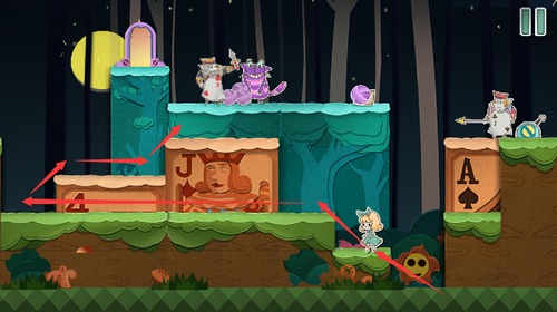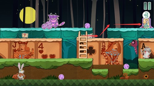 扑克兵会被滚动的球撞晕,抓住球体滚过的间隙,快速冲向右上角的门。