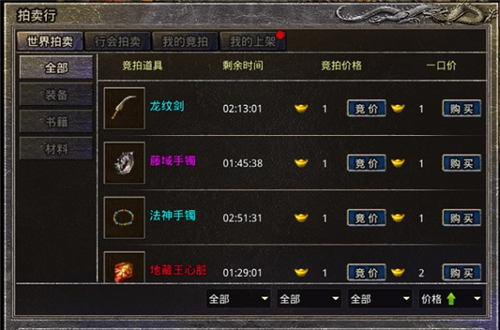 这是装备、材料与道具的交易平台,玩家可在此上架物品,并以传奇币或元宝定价起拍。