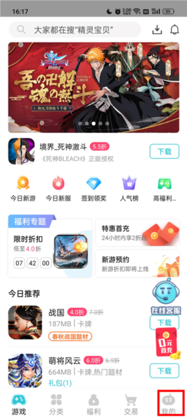 5、点击我的,可以登录app,查看积分,已下载的游戏等内容