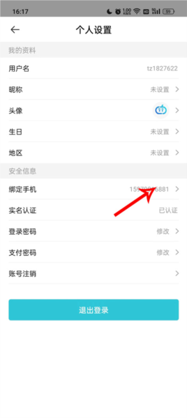 3、当进入到个人设置页面之后,在下方有一个安全信息栏目,在安全信息的第一栏就是绑定手机,点击进入;