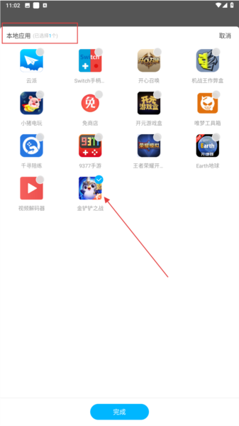 3、如需添加已安装的游戏,请在“本地应用”页面勾选目标游戏,例如“金铲铲之战”,随后点击“完成”确认添加。