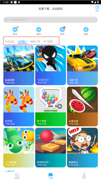 1、在软件主界面,可以通过点击“挑战”、“福利”或“新游”等入口进入;也可以直接点击游戏图标开始游玩。