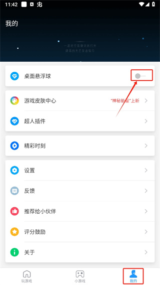 1、进入“我的”页面,找到并点击“桌面悬浮球”功能选项。