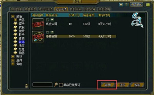 3、玩家还能点击界面中的试用按钮,将商品添加至奇宝斋试用列表。在试用页面可以查看或删除当前已试用的商品。试用流程为:玩家进入游戏的九重天区组,与NPC“九重天仙官”对话并支付200,000文钱,即可领取该商品体验60分钟。为优化体验,在九重天试用的商品将自动补满寿命、忠诚度、灵气、耐久度及风灵丸,同时装备的加点属性要求会暂时降至1点。