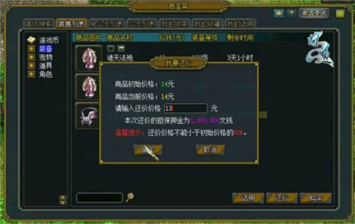 5、买家发起还价后,该还价有效期为24小时,可在我的收藏列表中查看。若卖家24小时内未同意,系统默认拒绝还价,担保金全额退回;如果买家主动撤销还价、卖家明确拒绝或商品信息失效,担保金也将全额返还。目前该功能已在无双倾城、五福临门、钱塘观潮、1心1意这四个公测区组试行,其他区组开放时间将另行通知。