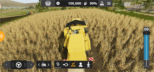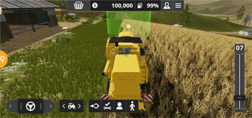 3、游戏初期你会拥有一块田地,例如图中成熟的小麦田,此时需要使用联合收割机进行收割;右侧滑动条控制油门,决定前进与后退,左侧方向盘则负责控制转向。