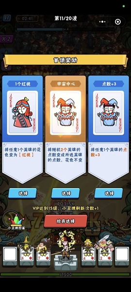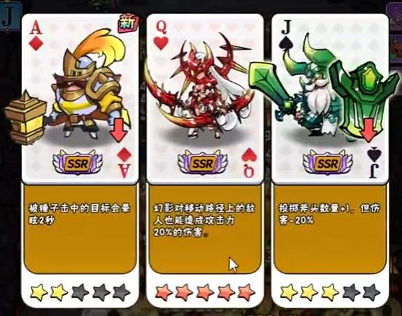 游戏开局会随机发放三张卡牌,不要只看英雄外观。记住原则:“点数越大,前期优势越明显”。