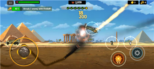 3、你需要不断袭击地面的动物、人类、车辆与飞机等目标,也可获取炸弹等强化道具来提升战力,通过击杀获得经验并升级;