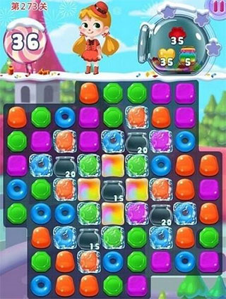 冰块会冻结内部的糖果,使其无法移动和交换;玩家需要匹配消除冰块内的糖果,才能破坏冰块障碍。