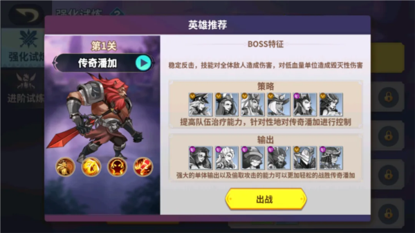 强化试炼的首领为传奇潘加,该首领可稳定反击,技能对全体造成伤害,并对低血量单位造成毁灭打击;应对策略:提升队伍治疗能力,并针对性地对其施加控制;我方输出:依靠强力单体伤害及偷取攻击的能力可更轻松地取胜。