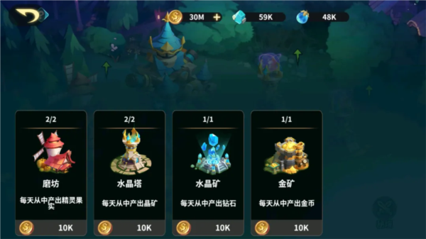 生产类建筑包括磨坊、晶矿工坊、炼金工坊、钻石工坊,分别产出精灵果实、晶矿、金币与钻石;升级建筑可提高产量,其中磨坊与晶矿工坊最多可建造3座;拆除建筑不会返还资源。