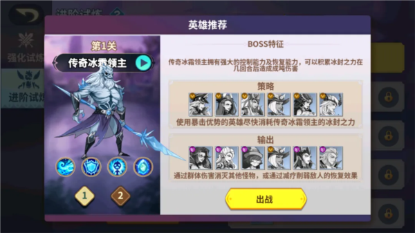 传奇冰霜领主拥有强大控制与恢复能力,可积累冰封之力在数回合后造成巨额伤害;应对策略:使用暴击优势英雄尽快消耗其冰封之力;我方输出:通过群体伤害清理杂兵,或利用减疗效果削弱其恢复。