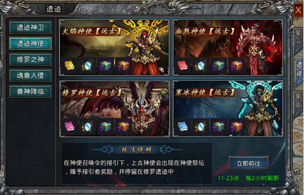 上古神使在11点至23点期间每两小时刷新,击杀分别掉落火焰法典、血煞法典、修罗宝典与寒冰法典;这些道具可用于供奉修罗神并换取丰厚奖励。
