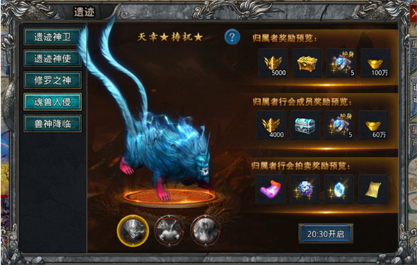开服25天后20点30分,遗迹开启跨服魂兽入侵;三只魂兽出现,行会成员可共同击败获取奖励,每次活动仅能进入一张地图。击败后归属者及同行会成员获得奖励,部分极品道具进入行会拍卖。