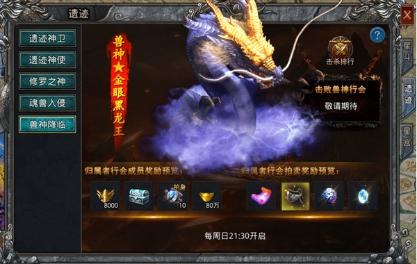 每周日21点30分至22点开启,魂兽入侵中击杀BOSS数量前四的行会可参与;行会成员合力击败兽神金眼黑龙王,争夺最终宝物归属。