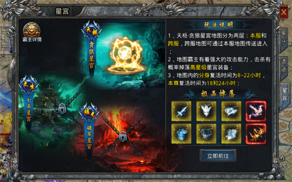 玩家转生等级达到18转后可进入对应星宫地图挑战;地图分本服与跨服,击败霸主有机会掉落高星级星宫装备。后续还有长生七杀星宫与摇光破军星宫等待探索。