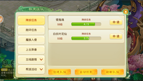 1、在活动界面选择降妖任务即可创建队伍,当队伍人数满足要求后,将自动前往女儿国坐标(142,45)寻找降妖师领取任务。