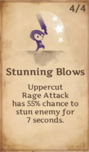 使上钩拳攻击有一定概率击晕敌人;概率随等级提升:4秒22%,5秒33%,6秒44%,7秒55%。