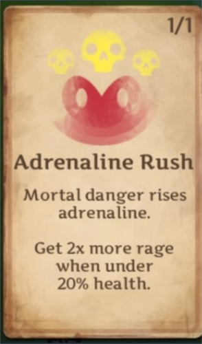 当生命值低于20%时,提供更多怒气;该技能实用性一般,因理想情况下应避免生命值过低。