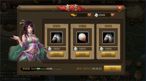 补充说明:商店购物需消耗银两或元宝;元宝通过充值获取,银两可用元宝兑换,比例是100元宝换50000银两;开启功勋宝箱也能得到银两。对商品不满意可以刷新,每次刷新增加30分钟冷却时间。刷新次数越多,与商店的亲密度越高,获得心仪物品的几率也越大。