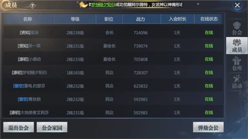 公会职位:分为会长、副会长、精英及普通成员。会长、副会长和精英拥有清理公会仓库的权限。