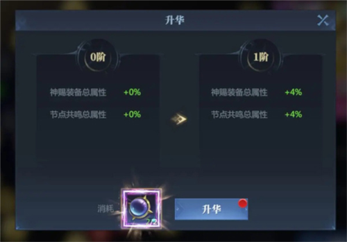 5、神赐升华:消耗神谕之兆可提升神赐升华等级,进而按百分比提高已穿戴神赐装备的属性及节点共鸣的固定值属性;未穿戴装备则加成无效。