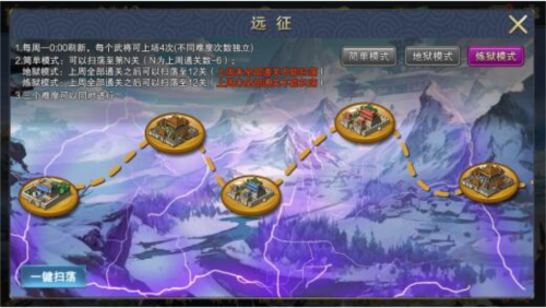 此模式后期难度较大,推荐使用程昱、陈群、张春华、司马懿、徐庶等武将。前50层较为简单,可用80级队伍自动通过,收获银币与技能书。
