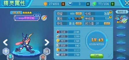 甲贺忍蛙为双足蛙类形态,深蓝身躯配黄色胸脯;四肢带白色浮囊及手里剑状星斑;颈间粉色围巾实为其舌头。种族值达五百三十,速度与攻击能力出色,属于较易培养的稀有精灵。