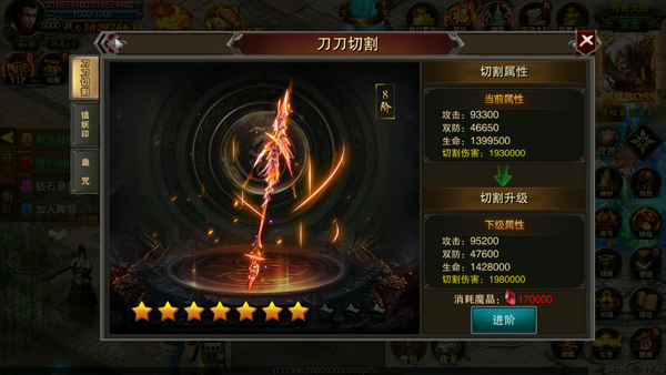 切割系统在前期作用显著,升级后能大幅增加额外伤害;消耗魔晶即可提升切割等级,魔晶可通过钻石、元宝在商店购买,每日限购百次;战功也可兑换魔晶,战功主要来源于跨服活动英雄会,该活动每周三、六晚开放,参与可获得军功用于兑换。