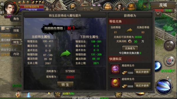 4、转生:角色达到80级后开启转生系统;提升转生等级可进入更高级地图与转生神殿,并能装备更强的转生装备,因此需与角色等级同步提升。