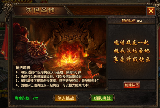 每日完成两次沃玛圣地任务可获得大量经验,前往比奇城寻找NPC【沃玛圣地】进入;