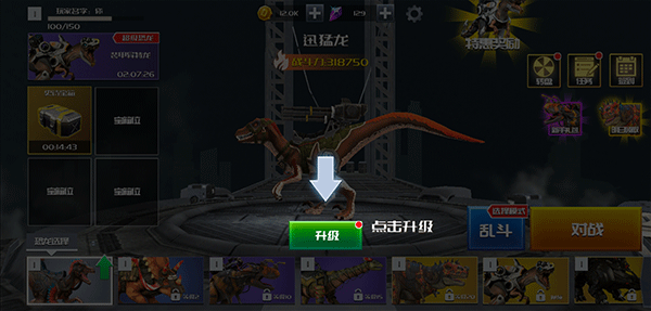 8、此外在首页恐龙选择界面,可以自由挑选出战的恐龙,也能对喜爱的恐龙进行升级,提升其战斗能力。