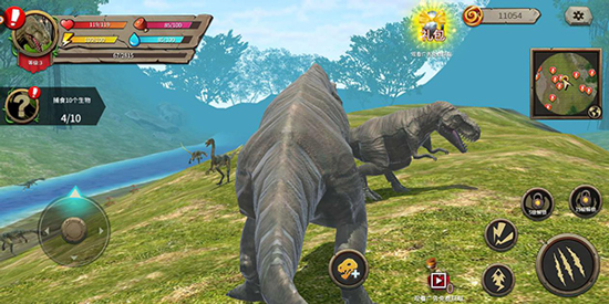 2、基本操控:利用屏幕左下角的虚拟摇杆来控制恐龙移动,探索周围环境或接近目标;通过滑动屏幕右侧区域,可以自由调整观察视角,便于瞄准或观察局势。
