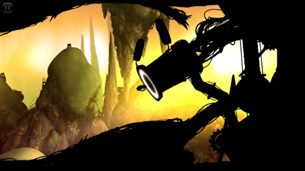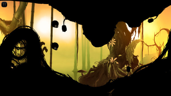2、图中眨着眼睛的小黑球是我们的冒险伙伴,点击屏幕后画面会匀速后退;只有持续点击才能让小黑向前飞行,越过枯木与碎石,躲避机关陷阱,到达森林尽头。