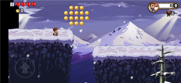 游戏采用虚拟按键控制,左手负责角色跳跃与障碍躲避,右手操控射击消灭敌人;操作简单易上手。每局角色拥有三条生命,触碰敌人或障碍会损失生命,若掉入悬崖则直接结束。