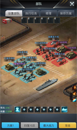 布阵时,若已知敌方阵容,基本原则是:第一排避免放置被对方克制的兵种,优先放置能克制敌方前排的部队;若无克制关系,则安排坦克或特种兵。第二排同样优先放置克制兵种,否则可多配置导弹车与飞机,以补充后排输出。