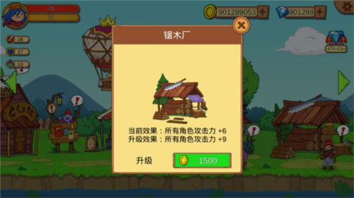 4、其他提示:每完成一系列关卡,会解锁新建筑;例如解锁锯木厂可为角色带来可观的攻击力提升。