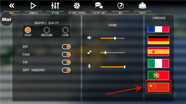 4、在语言列表中找到中国国旗图标,点击后游戏将自动关闭。